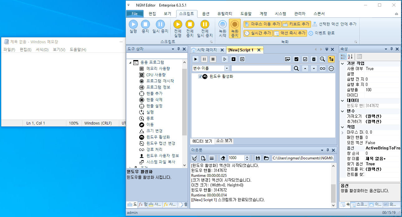 창을 활성화하기 위해 메모장을 하나 실행시킵니다. 그리고, 스크립트에 윈도우 활성화 액션을 하나 추가하세요.