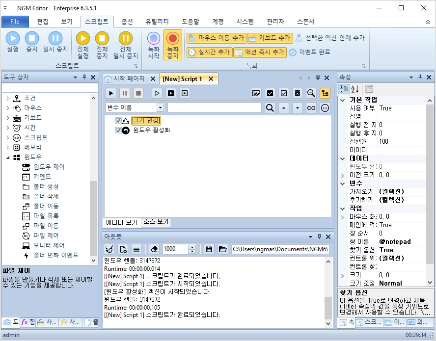 이번에는 메모장을 최소화 시켜놓고, 스크립트를 다시 실행 해보세요. 메모장이 활성화되지 않습니다. 윈도우 프로그램을 활성화하려면 창이 최대화 상태이거나 위와 같은 노말(Normal) 상태여야 합니다. 그래서, 창을 원래대로 복구(최대화 또는 노말 상태)해야 합니다. 아래 그림과 같이 창 크기를 변경할 수 있는 [ 크기 변경 ] 액션을 스크립트에 추가하세요.