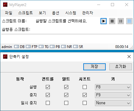안녕하세요. 엔지엠소프트웨어입니다. 엔지엠 에디터 또는 플레이어는 스크립트를 실행하거나 중지할 수 있는 단축키를 사용자가 임의로 설정할 수 있습니다. 엔지엠 에디터를 실행하고, 메뉴의 옵션에서 단축키 설정을 통해 스크립트 실행 및 중지등등... 개인화가 가능합니다.