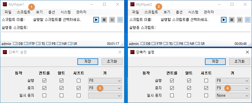 멀티 매니저에서 추가한 플레이어 이름이 각각의 플레이어의 제목(Title)에 표시됩니다. ①MyPlayer1, ②MyPlayer2 로 표시됩니다. 플레이어 각각 단축키 설정창을 표시하고, 첫번째 플레이어는 ③기본값인 Ctrl+Alt+Shift+F8로 놔둡니다. 두번째 플레이어는 ④Ctrl+Alt+Shift+F9로 변경하고, 저장 해줍니다.