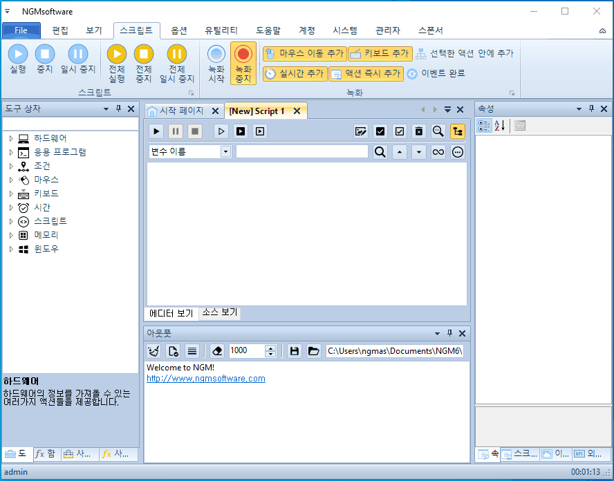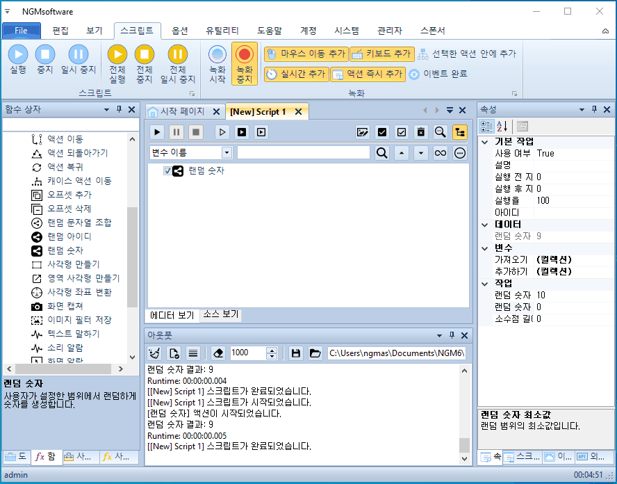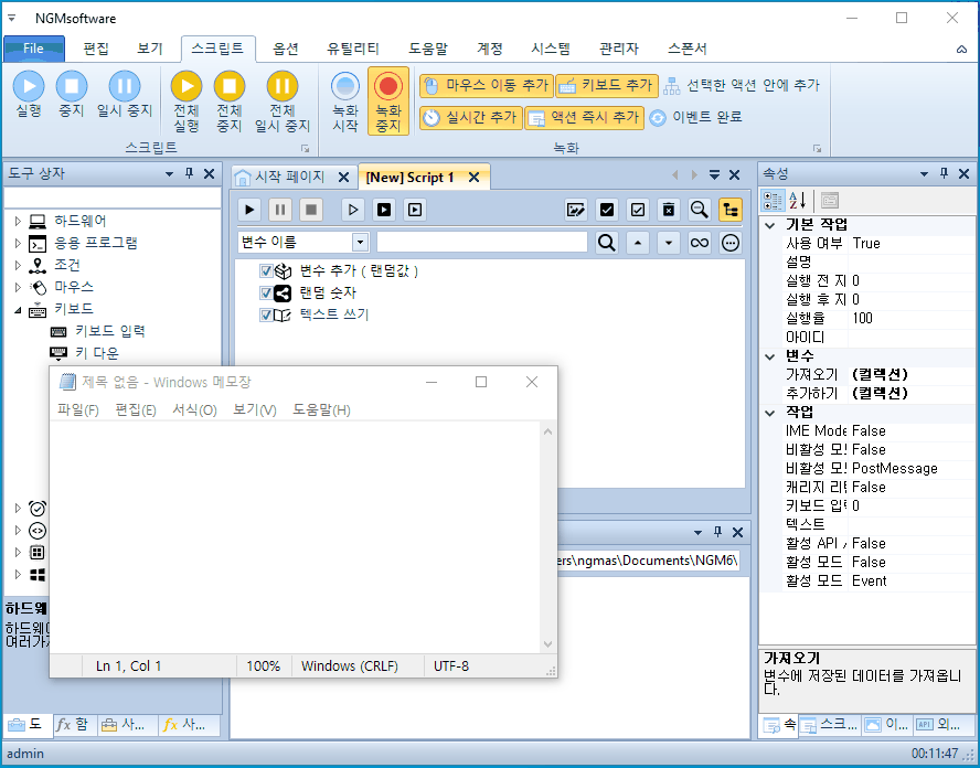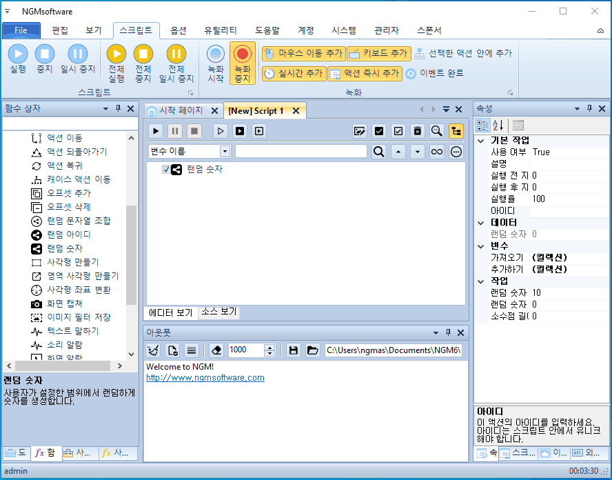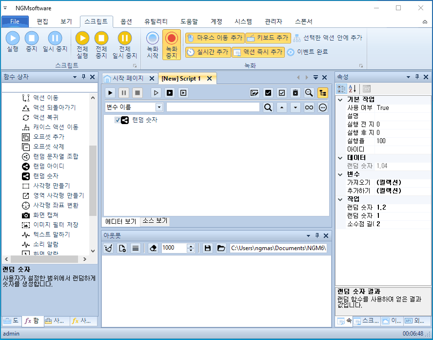 안녕하세요. 엔지엠소프트웨어입니다. 엔지엠 에디터에는 다양한 랜덤 함수가 존재합니다. [ 랜덤 문자열 조합 ], [ 랜덤 아이디 ], [ 랜덤 숫자 ]가 있는데요. 오늘 알아볼 내용은 랜덤 숫자 액션입니다. 랜덤하게 숫자를 만든 후 메모장, 엑셀 또는 기타 다른 프로그램 랜덤 숫자를 입력하는 방법입니다. 아래 동영상과 같이 에디터를 실행하고, 새로운 스크립트를 하나 추가하세요.