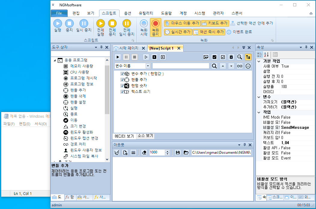 도구 상자의 응용 프로그램 > [ 핸들 추가 ]를 스크립트에 추가한 후 컨트롤 찾기로 메모장을 선택 해줍니다.