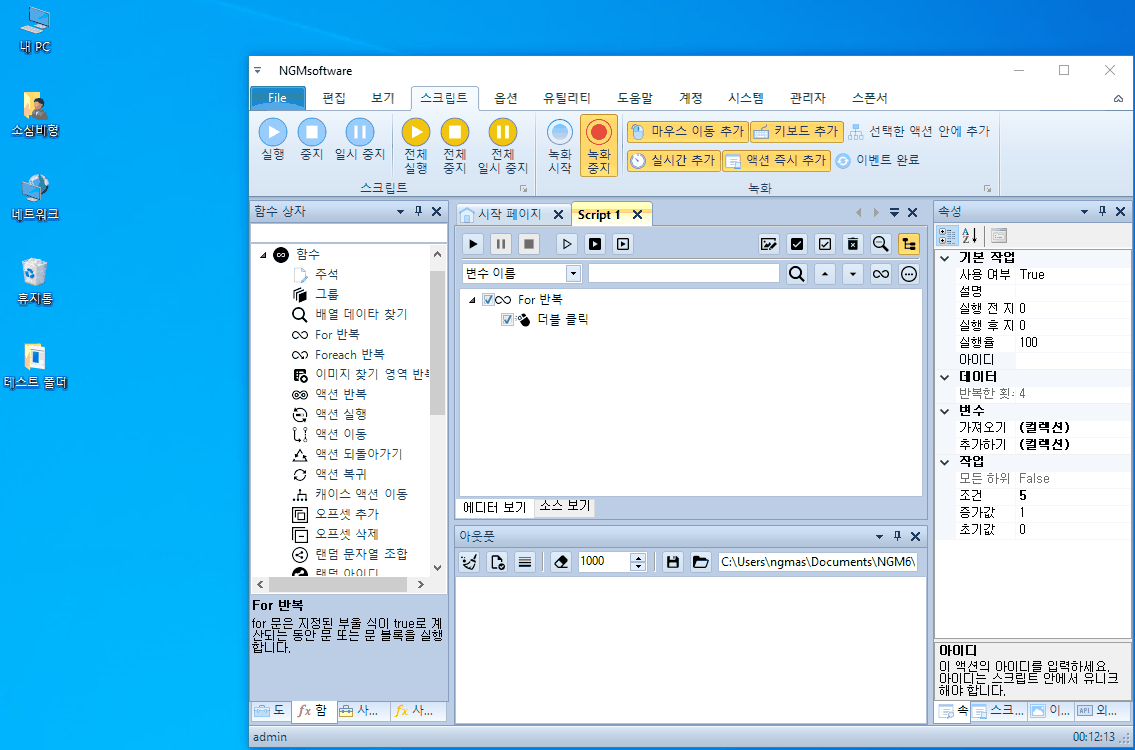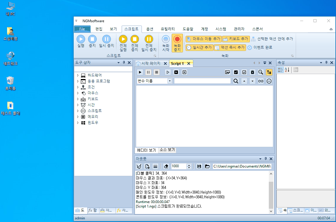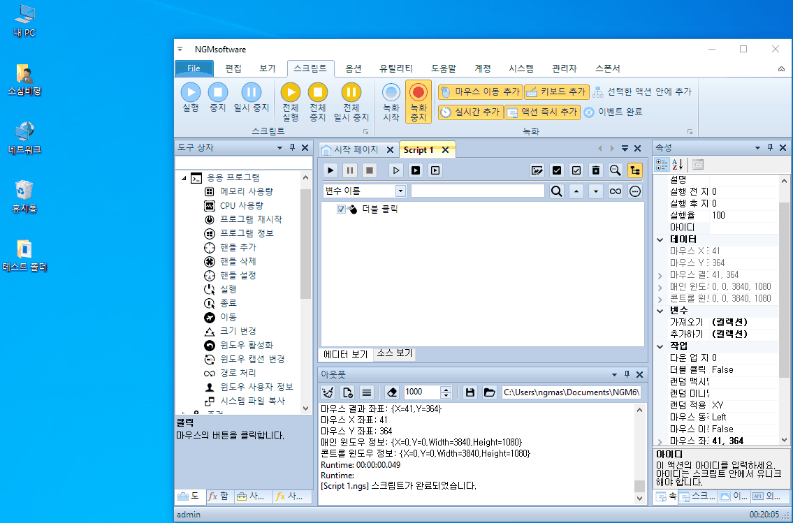 도구 상자의 마우스 > [ 더블 클릭 ] 액션을 스크립트에 추가하세요. 그리고, 바탕화면의 테스트 폴더를 좌표로 설정 해줍니다.