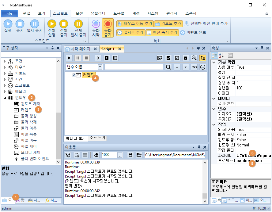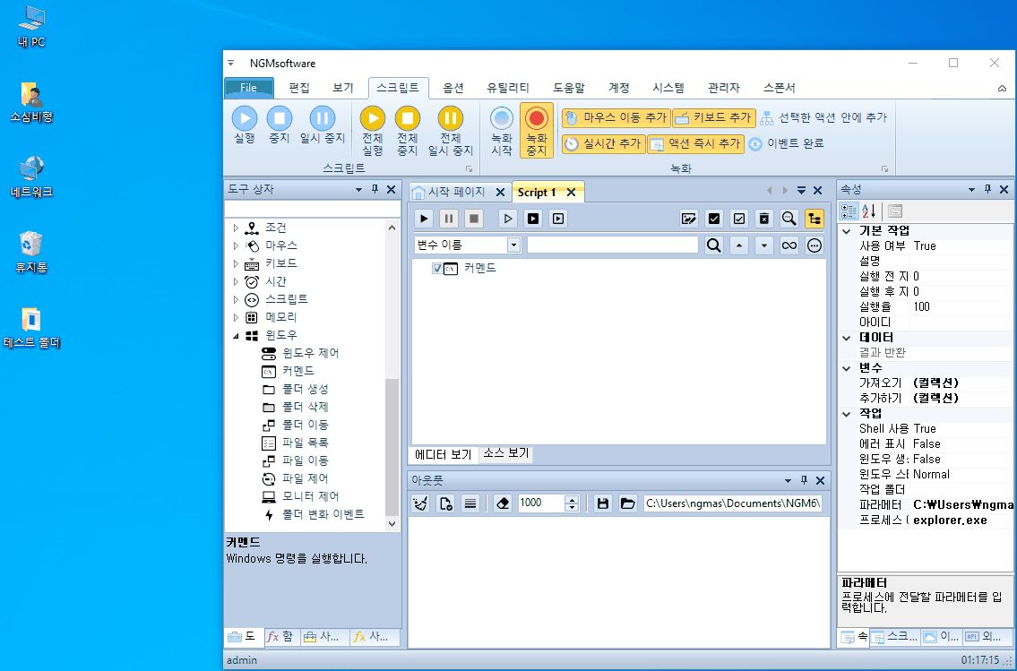 마지막으로 윈도우의 [ 커멘드 ] 액션을 사용해볼께요. 아래 그림과 같이 스크립트에 커멘드를 추가합니다.